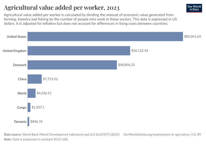 We see just how low the productivity is in the chart which compares the amount of agricultural ‘value added’ per person working in agriculture.