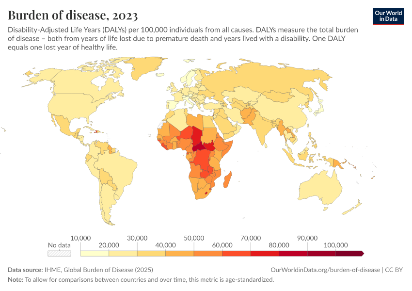 This map shows the annual rate of DALYs per 100,000 people in the population. It is thereby measuring the distribution of the burden of both mortality and morbidity around the world.