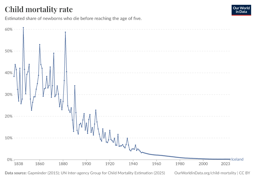 The global inequality we see today is the consequence of unequal progress. Even in today’s healthiest and wealthiest countries, the low child mortality rates are a very recent achievement: the chart shows the decline of child mortality in the country that has the lowest child mortality today. In the 19th century around a third of all children in Iceland died (a much higher rate than in today’s worst-off countries). Good child health is the consequence of the progress achieved in the country’s modern history.