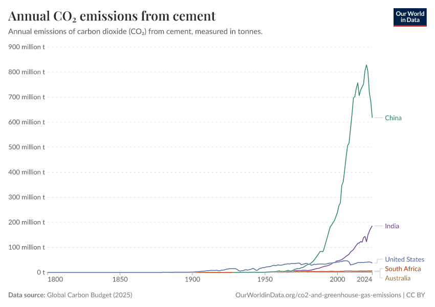 This interactive chart shows per capita CO2 emissions from cement production, measured in tonnes per person per year.