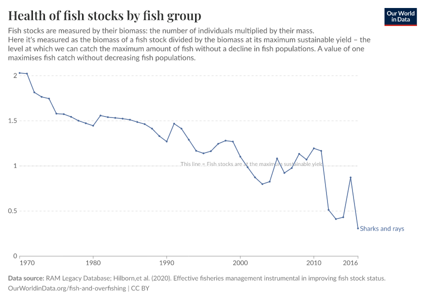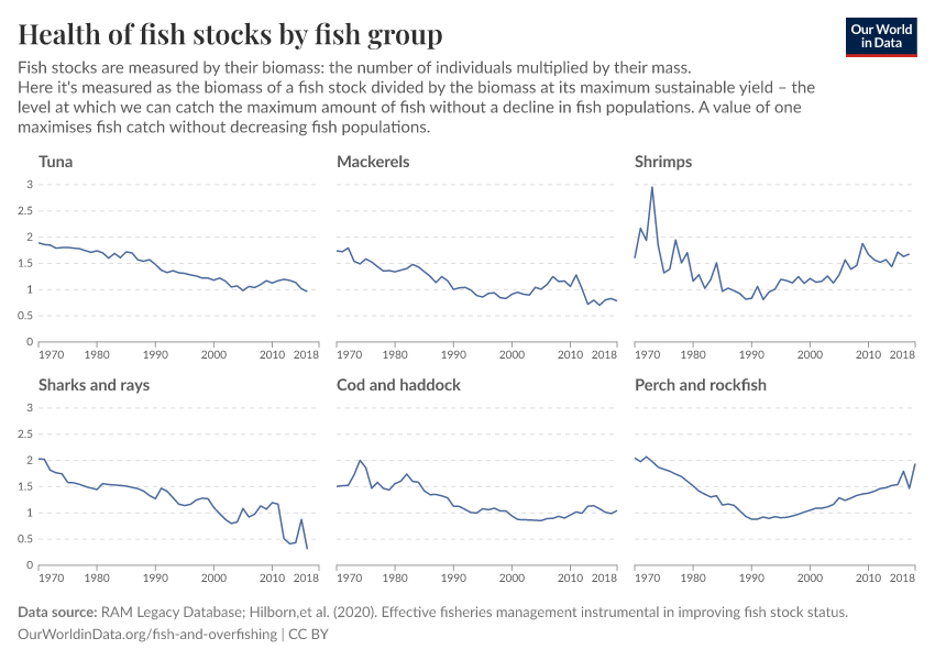 This is often measured in terms of fish stocks. A fish stock is a subpopulation of a particular species of fish with common parameters such as location, growth, and mortality. Often, it’s a species of fish in a given location. Indian Ocean tuna, for example. Importantly, this metric treats each fish stock as being equal, regardless of how big each stock is. A stock where we catch 1000 tonnes is counted the same as a stock where we catch 10 tonnes.