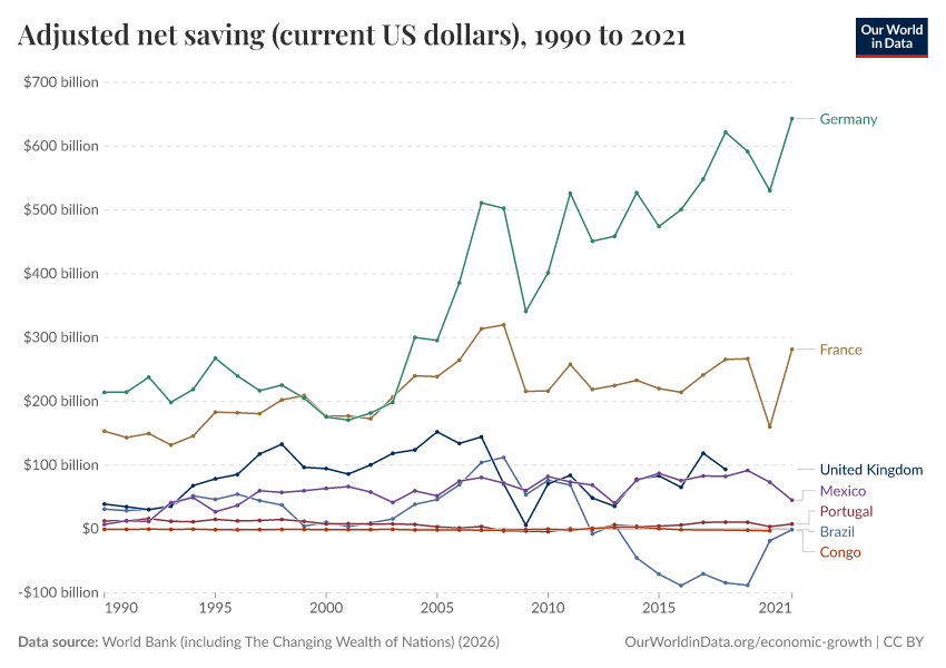 World Bank (including The Changing Wealth of Nations) (2026) – processed by Our World in Data. “Adjusted net saving (current US dollars)” [dataset]. World Bank (including The Changing Wealth of Nations), “World Development Indicators 125” [original data]. Retrieved March 2, 2026 from https://data-wdi-depsupdate.owid.pages.dev:8789/20260301-083443/grapher/adjusted-net-saving-current-us-dollars.html (archived on March 1, 2026).