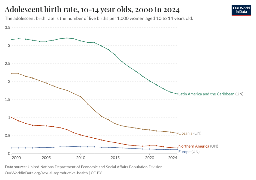 United Nations Department of Economic and Social Affairs Population Division – processed by Our World in Data. “Adolescent birth rate, 10-14 year olds” [dataset]. United Nations Department of Economic and Social Affairs Population Division, “Data from multiple sources” [original data]. Retrieved March 2, 2026 from https://data-wdi-depsupdate.owid.pages.dev:8789/20260130-180113/grapher/adolescent-fertility.html (archived on January 30, 2026).