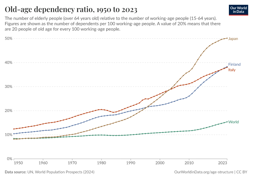 “Data Page: Old-age dependency ratio, age old”. Our World in Data (2026). Data adapted from United Nations. Retrieved from https://data-wdi-depsupdate.owid.pages.dev:8789/20260225-004721/grapher/age-dependency-ratio-old.html [online resource] (archived on February 25, 2026).How to cite this data