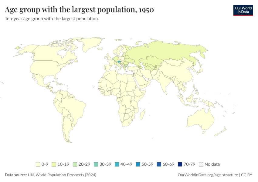 “Data Page: Ten year age-group with the highest population”. Our World in Data (2026). Data adapted from United Nations. Retrieved from https://data-wdi-depsupdate.owid.pages.dev:8789/20260225-014904/grapher/age-group-with-the-largest-population.html [online resource] (archived on February 25, 2026).How to cite this data