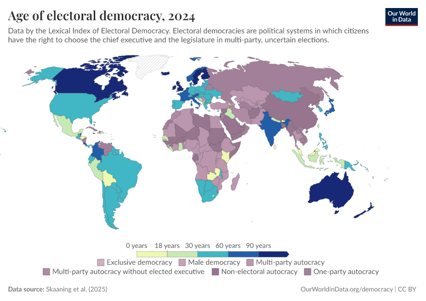 Skaaning et al. (2025) – processed by Our World in Data. “Age of electoral democracy” [dataset]. Skaaning et al., “Lexical Index of Electoral Democracy (LIED) v6.8” [original data]. Retrieved March 2, 2026 from https://data-wdi-depsupdate.owid.pages.dev:8789/20260119-065148/grapher/age-of-electoral-democracy-lexical.html (archived on January 19, 2026).