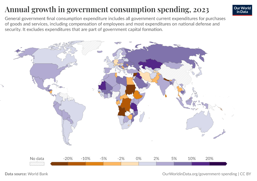 “Data Page: Annual growth in government consumption spending”. Our World in Data (2026). Data adapted from World Bank. Retrieved from https://data-wdi-depsupdate.owid.pages.dev:8789/20260130-180113/grapher/annual-growth-of-general-government-final-consumption-expenditure.html [online resource] (archived on January 30, 2026).How to cite this data