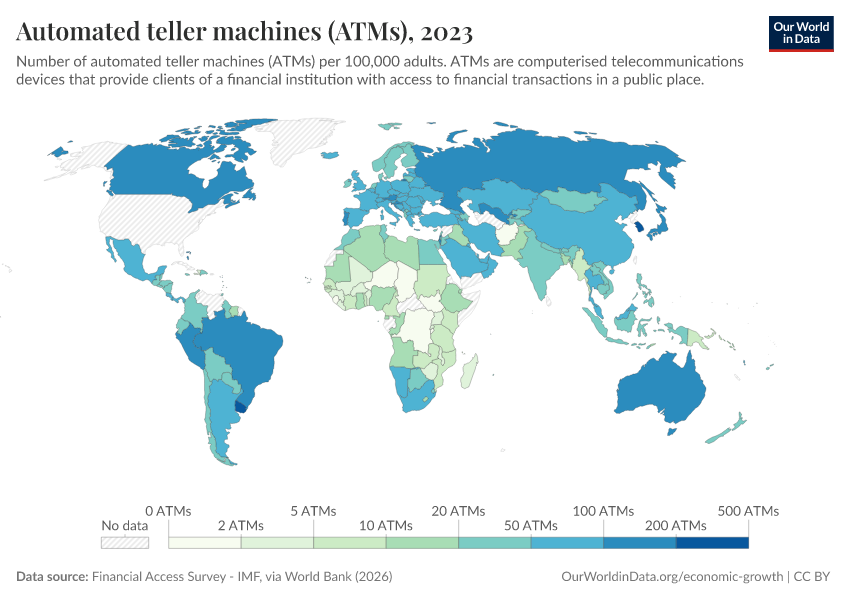 “Data Page: Automated teller machines (ATMs)”. Our World in Data (2026). Data adapted from Financial Access Survey - IMF, via World Bank. Retrieved from https://data-wdi-depsupdate.owid.pages.dev:8789/20260301-083443/grapher/automated-teller-machines-atms-per-100000-adults.html [online resource] (archived on March 1, 2026).How to cite this data