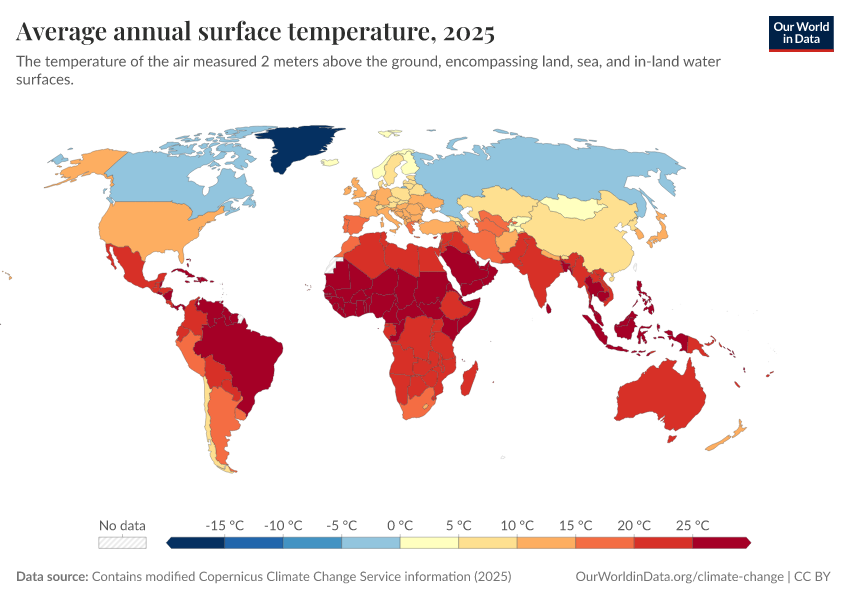 Contains modified Copernicus Climate Change Service information (2025) – with major processing by Our World in Data. “Average annual surface temperature” [dataset]. Contains modified Copernicus Climate Change Service information, “ERA5 monthly averaged data on single levels from 1940 to present 2” [original data]. Retrieved March 2, 2026 from https://data-wdi-depsupdate.owid.pages.dev:8789/20260225-180245/grapher/average-annual-surface-temperature.html (archived on February 25, 2026).