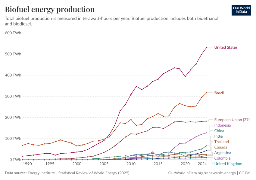 Energy Institute - Statistical Review of World Energy (2025) – with major processing by Our World in Data. “Biofuels production” [dataset]. Energy Institute, “Statistical Review of World Energy” [original data]. Retrieved March 2, 2026 from https://data-wdi-depsupdate.owid.pages.dev:8789/20260119-065148/grapher/biofuel-production.html (archived on January 19, 2026).