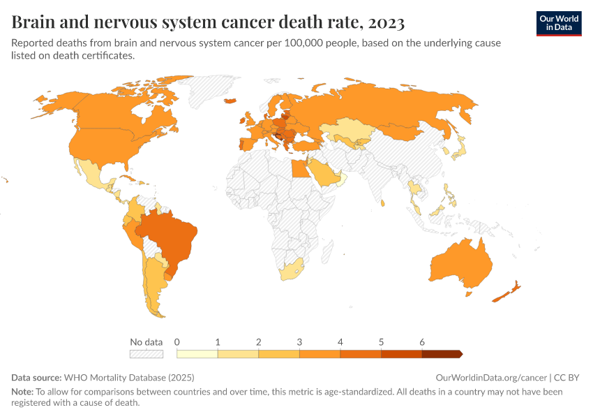 WHO Mortality Database (2025) – with minor processing by Our World in Data. “Brain and nervous system cancer death rate” [dataset]. WHO Mortality Database, “WHO Mortality Database” [original data]. Retrieved March 2, 2026 from https://data-wdi-depsupdate.owid.pages.dev:8789/20250909-093708/grapher/brain-and-nervous-system-cancer-death-rate.html (archived on September 9, 2025).