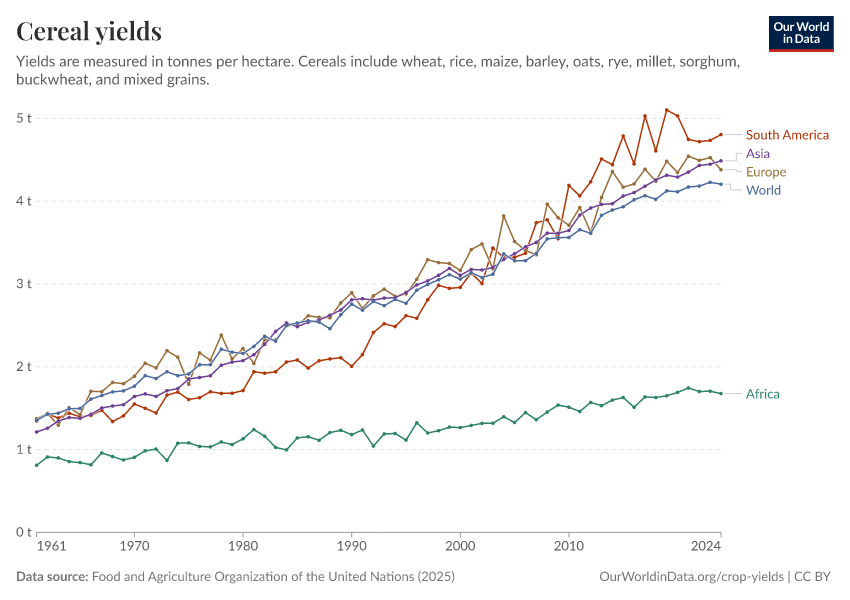 “Data Page: Cereal yields”, part of the following publication: Hannah Ritchie, Pablo Rosado, and Max Roser (2023) - “Agricultural Production”. Data adapted from Food and Agriculture Organization of the United Nations. Retrieved from https://data-wdi-depsupdate.owid.pages.dev:8789/20260226-122020/grapher/cereal-yield.html [online resource] (archived on February 26, 2026).