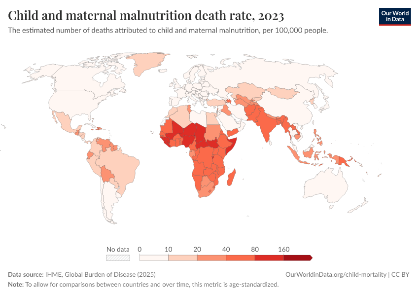 IHME, Global Burden of Disease (2025) – with major processing by Our World in Data. “Child and maternal malnutrition death rate” [dataset]. IHME, Global Burden of Disease, “Global Burden of Disease - Risk Factors - Deaths” [original data]. Retrieved March 2, 2026 from https://data-wdi-depsupdate.owid.pages.dev:8789/20260213-112438/grapher/child-and-maternal-malnutrition-death-rate.html (archived on February 13, 2026).