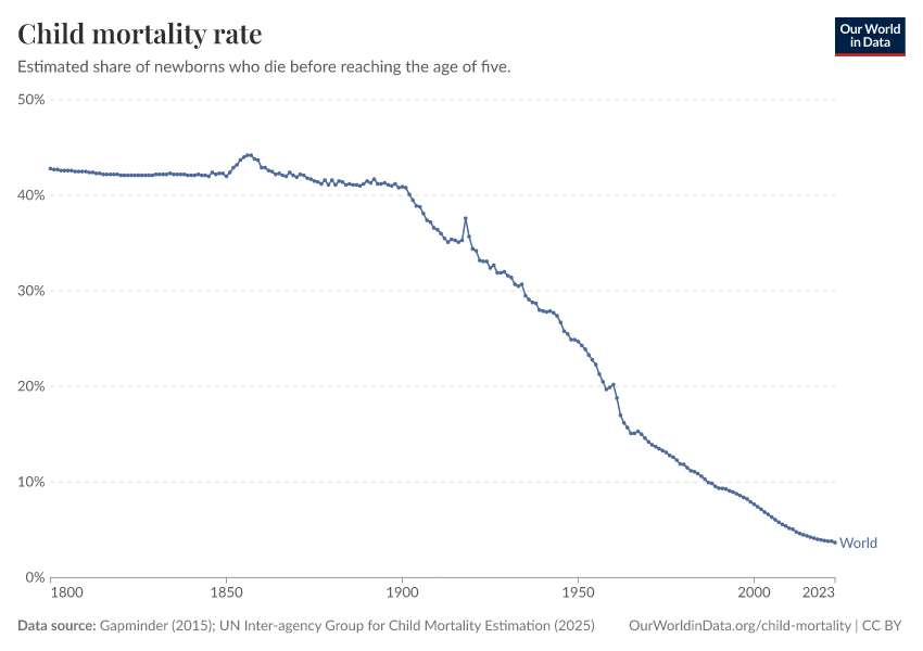 Gapminder (2015); UN Inter-agency Group for Child Mortality Estimation (2025) – processed by Our World in Data. “Child mortality rate – Gapminder; UN IGME – Long-run data” [dataset]. United Nations Inter-agency Group for Child Mortality Estimation, “United Nations Inter-agency Group for Child Mortality Estimation”; Gapminder, “Child mortality rate under age five v7”; Gapminder based on UN IGME & UN WPP, “Under-five Mortality v11”; Various sources, “Population” [original data]. Retrieved March 2, 2026 from https://data-wdi-depsupdate.owid.pages.dev:8789/20260119-070102/grapher/child-mortality.html (archived on January 19, 2026).