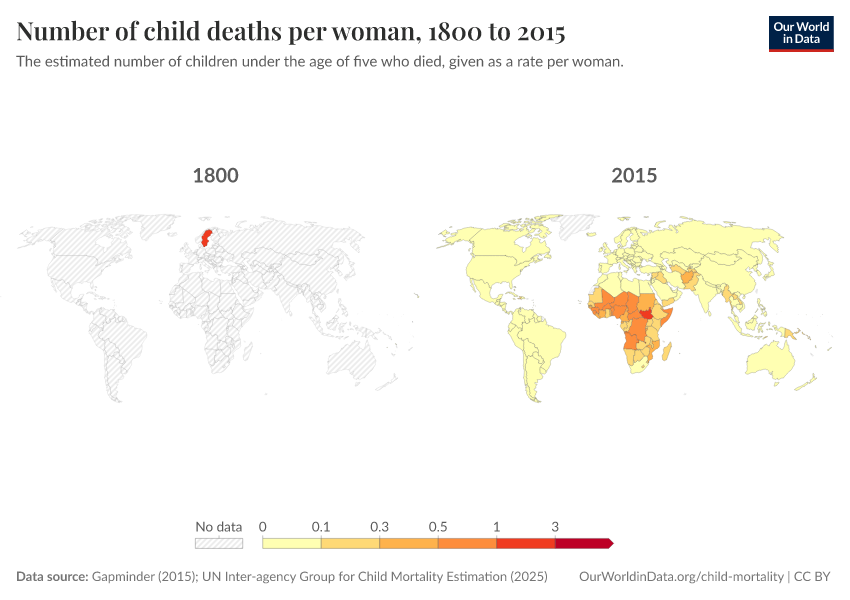 Gapminder (2015); UN Inter-agency Group for Child Mortality Estimation (2025) – processed by Our World in Data. “Child mortality rate – Gapminder; UN IGME – Long-run data” [dataset]. United Nations Inter-agency Group for Child Mortality Estimation, “United Nations Inter-agency Group for Child Mortality Estimation”; Gapminder, “Child mortality rate under age five v7”; Gapminder based on UN IGME & UN WPP, “Under-five Mortality v11”; United Nations, “World Population Prospects”; Gapminder, “Babies per woman (total fertility rate) v12”; Various sources, “Population” [original data]. Retrieved March 2, 2026 from https://data-wdi-depsupdate.owid.pages.dev:8789/20260119-070102/grapher/children-died-before-five-per-woman.html (archived on January 19, 2026).