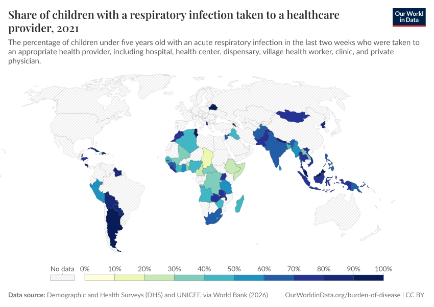 Demographic and Health Surveys (DHS) and UNICEF, via World Bank (2026) – processed by Our World in Data. “Share of children with a respiratory infection taken to a healthcare provider ” [dataset]. Demographic and Health Surveys (DHS) and UNICEF, via World Bank, “World Development Indicators 125” [original data]. Retrieved March 2, 2026 from https://data-wdi-depsupdate.owid.pages.dev:8789/20260301-083443/grapher/children-treated-ari.html (archived on March 1, 2026).