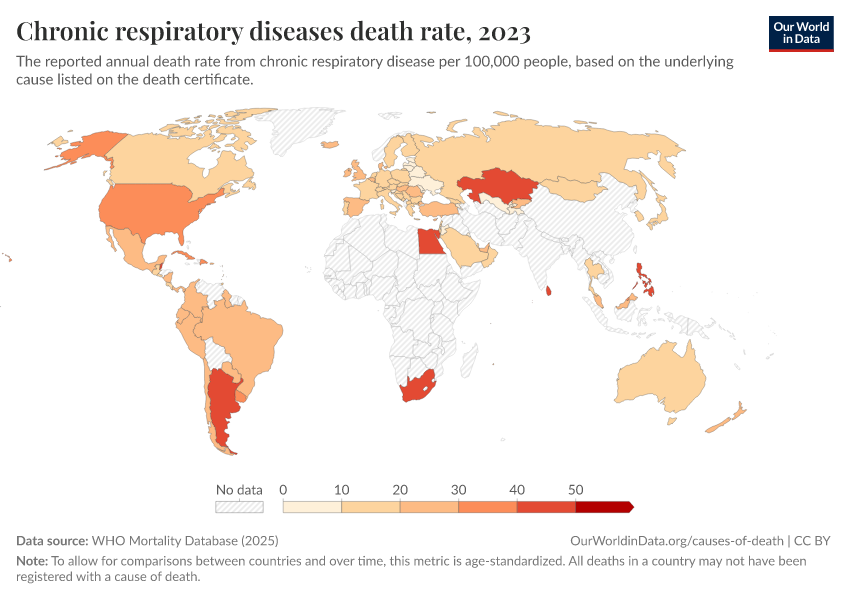 “Data Page: Chronic respiratory diseases death rate”, part of the following publication: Saloni Dattani, Fiona Spooner, Hannah Ritchie, and Max Roser (2023) - “Causes of Death”. Data adapted from WHO Mortality Database. Retrieved from https://data-wdi-depsupdate.owid.pages.dev:8789/20250909-093708/grapher/chronic-respiratory-diseases-death-rate-who-mdb.html [online resource] (archived on September 9, 2025).How to cite this data