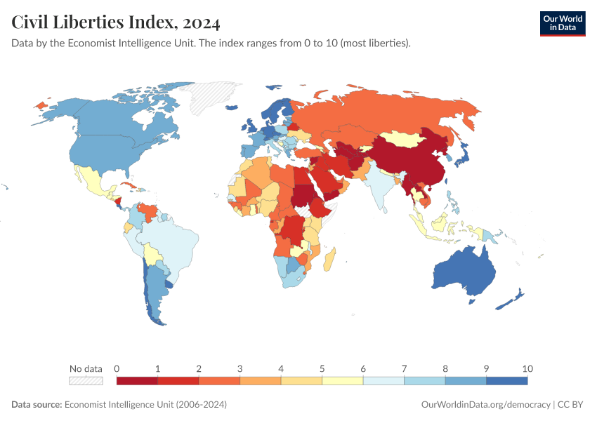 Economist Intelligence Unit (2006-2024) – processed by Our World in Data. “Civil Liberties Index” [dataset]. Economist Intelligence Unit, “Democracy Index 2021: The China challenge”; Economist Intelligence Unit, “Democracy Index 2022: Frontline democracy and the battle for Ukraine”; Economist Intelligence Unit, “Democracy Index 2023: Age of Conflict”; Economist Intelligence Unit, “Democracy Index 2024: What's wrong with representative democracy?”; Gapminder, “Democracy Index v4”; Various sources, “Population” [original data]. Retrieved March 2, 2026 from https://data-wdi-depsupdate.owid.pages.dev:8789/20260119-070102/grapher/civil-liberties-index-eiu.html (archived on January 19, 2026).