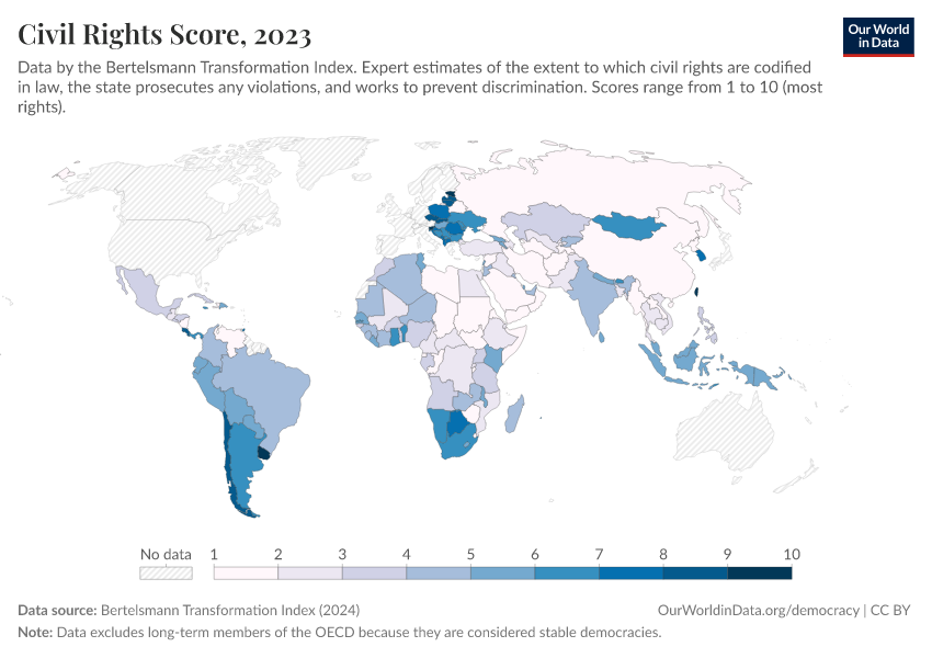 Bertelsmann Transformation Index (2024) – processed by Our World in Data. “Civil Rights Score” [dataset]. Bertelsmann Transformation Index, “Bertelsmann Transformation Index, Scores” [original data]. Retrieved March 2, 2026 from https://data-wdi-depsupdate.owid.pages.dev:8789/20260204-165456/grapher/civil-rights-score-bti.html (archived on February 4, 2026).