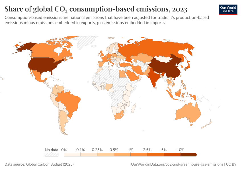 “Data Page: Share of global CO₂ consumption-based emissions”, part of the following publication: Hannah Ritchie, Pablo Rosado, and Max Roser (2023) - “CO₂ and Greenhouse Gas Emissions”. Data adapted from Global Carbon Project. Retrieved from https://data-wdi-depsupdate.owid.pages.dev:8789/20260119-070102/grapher/co2-consumption-share.html [online resource] (archived on January 19, 2026).How to cite this data