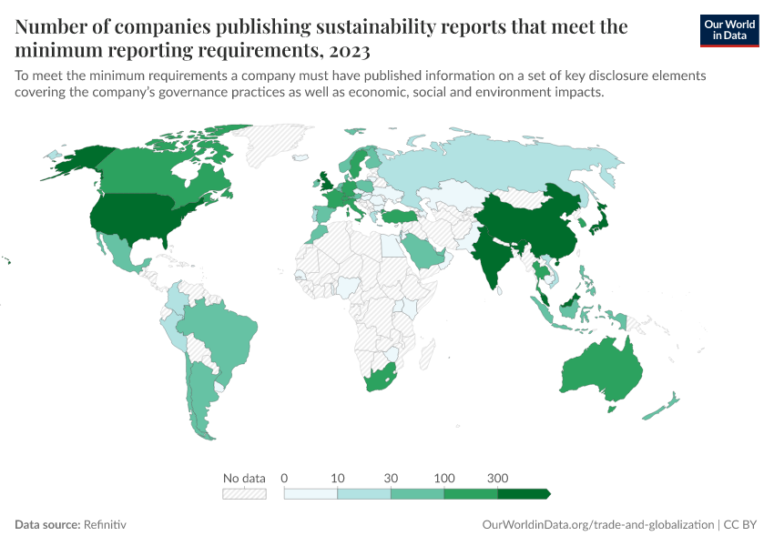 “Data Page: Number of companies publishing sustainability reports that meet the minimum reporting requirements”. Our World in Data (2026). Data adapted from Refinitiv. Retrieved from https://data-wdi-depsupdate.owid.pages.dev:8789/20260130-180113/grapher/companies-publishing-sustainability-reports-minimum-requirements.html [online resource] (archived on January 30, 2026).How to cite this data