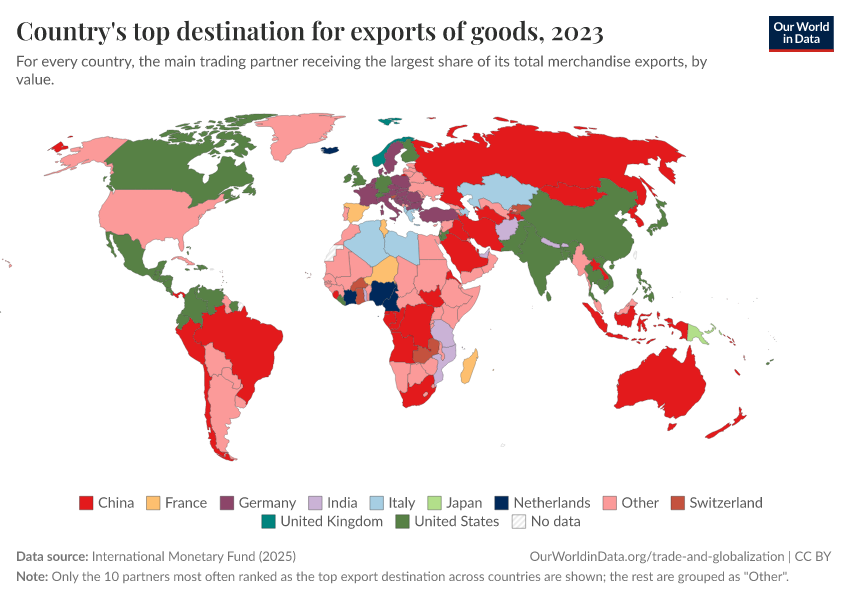 International Monetary Fund (2025) – with major processing by Our World in Data. “Top export partner category” [dataset]. International Monetary Fund, “International Trade in Goods (by partner country) (IMTS)” [original data]. Retrieved March 2, 2026 from https://data-wdi-depsupdate.owid.pages.dev:8789/20251114-012441/grapher/countrys-top-destination-for-exports-of-goods.html (archived on November 14, 2025).
