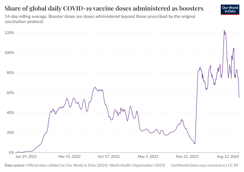 Official data collated by Our World in Data (2024); World Health Organisation (2025) – with major processing by Our World in Data. “Share of global daily COVID-19 vaccine doses administered as boosters” [dataset]. Official data collated by Our World in Data, “COVID-19, vaccinations”; World Health Organisation, “COVID-19, vaccinations (WHO)” [original data]. Retrieved March 2, 2026 from https://data-wdi-depsupdate.owid.pages.dev:8789/20250909-093708/grapher/covid-vaccine-share-boosters.html (archived on September 9, 2025).