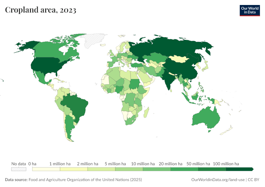 “Data Page: Cropland area”, part of the following publication: Hannah Ritchie, Pablo Rosado, and Max Roser (2023) - “Agricultural Production”. Data adapted from Food and Agriculture Organization of the United Nations. Retrieved from https://data-wdi-depsupdate.owid.pages.dev:8789/20260226-122020/grapher/cropland-area.html [online resource] (archived on February 26, 2026).
