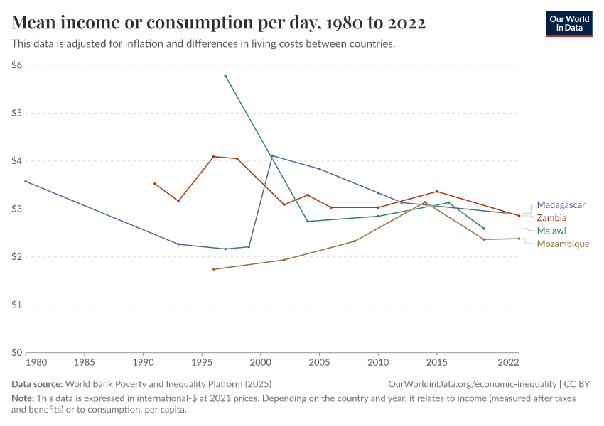 World Bank Poverty and Inequality Platform (2025) – with major processing by Our World in Data. “Mean income or consumption per day – World Bank” [dataset]. World Bank Poverty and Inequality Platform, “World Bank Poverty and Inequality Platform (PIP) 20250930_2021, 20250930_2017” [original data]. Retrieved March 2, 2026 from https://data-wdi-depsupdate.owid.pages.dev:8789/20260127-114142/grapher/daily-mean-income.html (archived on January 27, 2026).