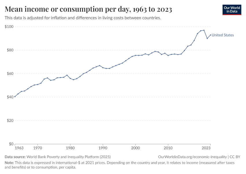 World Bank Poverty and Inequality Platform (2025) – with major processing by Our World in Data. “Mean income or consumption per day – World Bank” [dataset]. World Bank Poverty and Inequality Platform, “World Bank Poverty and Inequality Platform (PIP) 20250930_2021, 20250930_2017” [original data]. Retrieved March 2, 2026 from https://data-wdi-depsupdate.owid.pages.dev:8789/20260127-114142/grapher/daily-mean-income.html (archived on January 27, 2026).