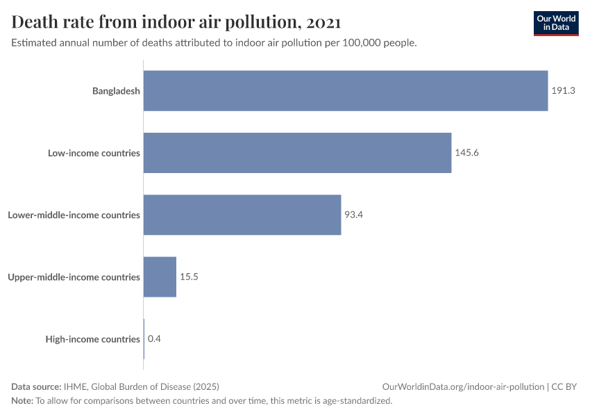IHME, Global Burden of Disease (2025) – with major processing by Our World in Data. “Death rate from indoor air pollution” [dataset]. IHME, Global Burden of Disease, “Global Burden of Disease - Risk Factors - Deaths” [original data]. Retrieved March 2, 2026 from https://data-wdi-depsupdate.owid.pages.dev:8789/20260213-112438/grapher/death-rate-by-source-from-indoor-air-pollution.html (archived on February 13, 2026).
