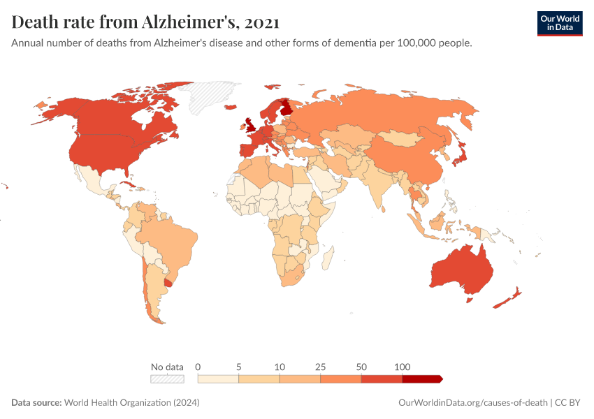 World Health Organization (2024) – with major processing by Our World in Data. “Death rate from Alzheimer's” [dataset]. World Health Organization, “Global Health Estimates” [original data]. Retrieved March 2, 2026 from https://data-wdi-depsupdate.owid.pages.dev:8789/20250909-093708/grapher/death-rate-from-alzheimers-other-dementias-ghe.html (archived on September 9, 2025).