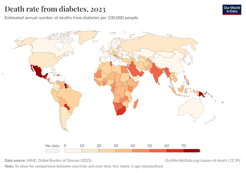 IHME, Global Burden of Disease (2025) – with major processing by Our World in Data. “Death rate from diabetes” [dataset]. IHME, Global Burden of Disease, “Global Burden of Disease - Deaths” [original data]. Retrieved March 2, 2026 from https://data-wdi-depsupdate.owid.pages.dev:8789/20260211-174736/grapher/death-rate-from-diabetes.html (archived on February 11, 2026).