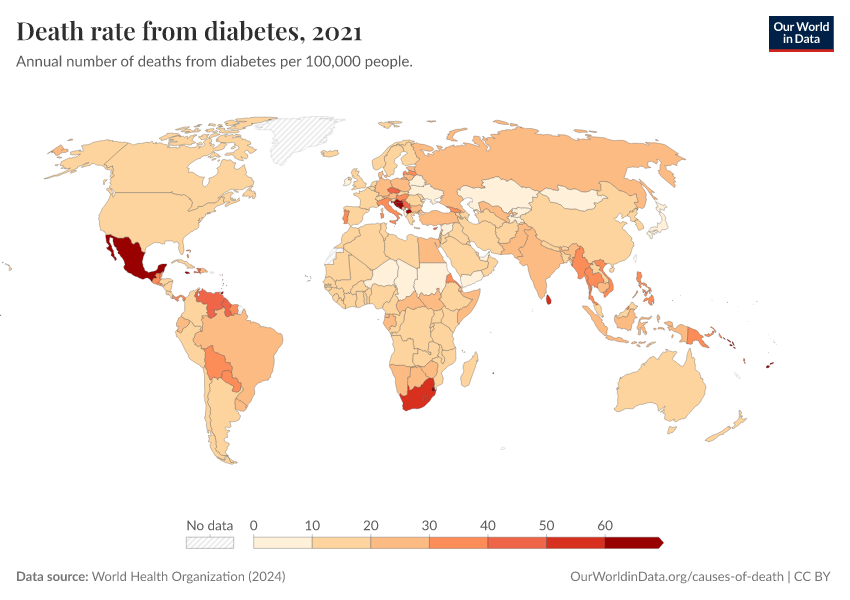 World Health Organization (2024) – with major processing by Our World in Data. “Death rate from diabetes” [dataset]. World Health Organization, “Global Health Estimates” [original data]. Retrieved March 2, 2026 from https://data-wdi-depsupdate.owid.pages.dev:8789/20250909-093708/grapher/death-rate-from-diabetes-ghe.html (archived on September 9, 2025).