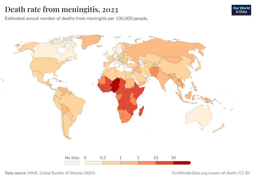 “Data Page: Death rate from meningitis”, part of the following publication: Esteban Ortiz-Ospina and Max Roser (2016) - “Global Health”. Data adapted from IHME, Global Burden of Disease. Retrieved from https://data-wdi-depsupdate.owid.pages.dev:8789/20260211-174736/grapher/death-rate-from-meningitis-gbd.html [online resource] (archived on February 11, 2026).How to cite this data