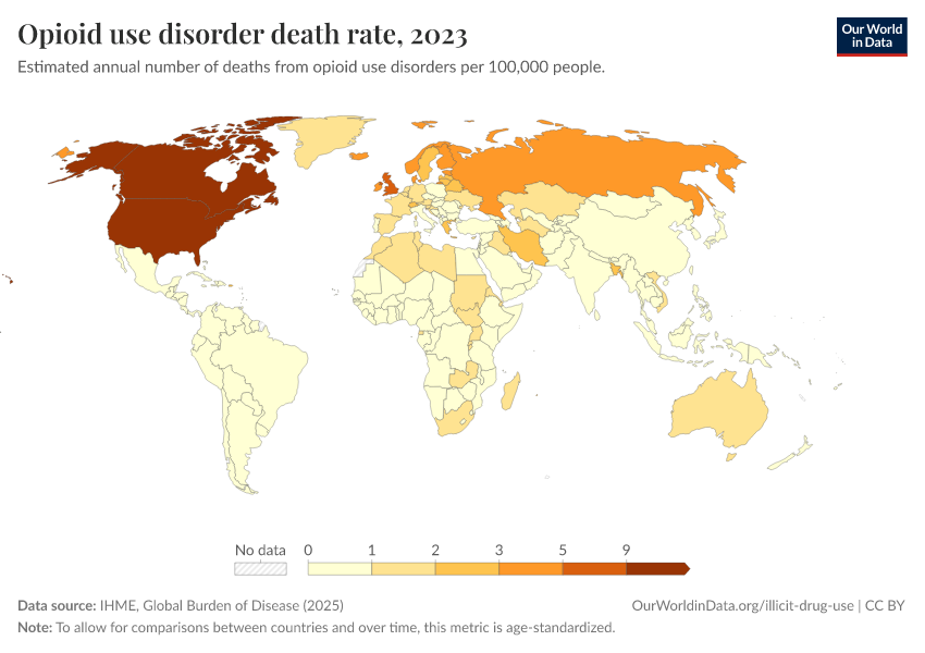 IHME, Global Burden of Disease (2025) – with major processing by Our World in Data. “Opioid use disorder death rate” [dataset]. IHME, Global Burden of Disease, “Global Burden of Disease - Deaths” [original data]. Retrieved March 2, 2026 from https://data-wdi-depsupdate.owid.pages.dev:8789/20260211-174736/grapher/death-rate-from-opioid-use.html (archived on February 11, 2026).