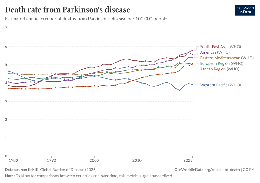 IHME, Global Burden of Disease (2025) – with major processing by Our World in Data. “Death rate from Parkinson's disease” [dataset]. IHME, Global Burden of Disease, “Global Burden of Disease - Deaths” [original data]. Retrieved March 2, 2026 from https://data-wdi-depsupdate.owid.pages.dev:8789/20260211-174736/grapher/death-rate-from-parkinsons-disease.html (archived on February 11, 2026).