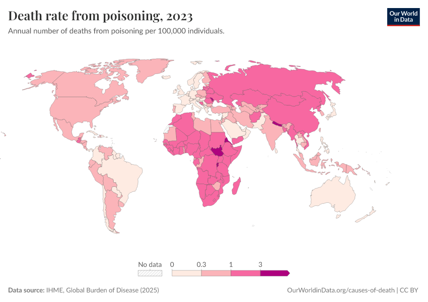 IHME, Global Burden of Disease (2025) – with major processing by Our World in Data. “Death rate from poisoning” [dataset]. IHME, Global Burden of Disease, “Global Burden of Disease - Deaths” [original data]. Retrieved March 2, 2026 from https://data-wdi-depsupdate.owid.pages.dev:8789/20260211-174736/grapher/death-rate-from-poisoning-gbd.html (archived on February 11, 2026).