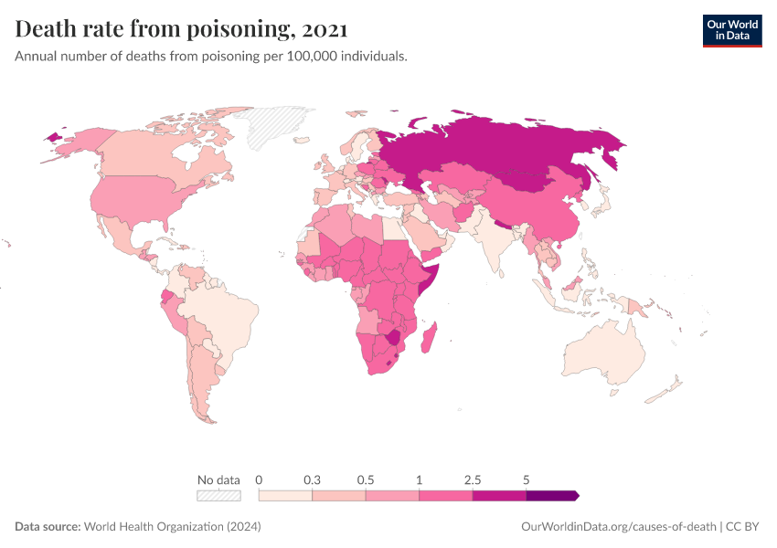 World Health Organization (2024) – with major processing by Our World in Data. “Death rate from poisoning” [dataset]. World Health Organization, “Global Health Estimates” [original data]. Retrieved March 2, 2026 from https://data-wdi-depsupdate.owid.pages.dev:8789/20250909-093708/grapher/death-rate-from-poisoning-ghe.html (archived on September 9, 2025).