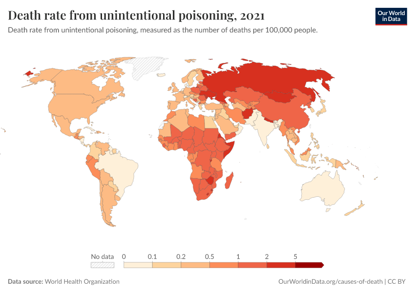 “Data Page: Death rate from unintentional poisoning”. Our World in Data (2026). Data adapted from World Health Organization. Retrieved from https://data-wdi-depsupdate.owid.pages.dev:8789/20260130-180113/grapher/death-rate-from-poisonings.html [online resource] (archived on January 30, 2026).How to cite this data