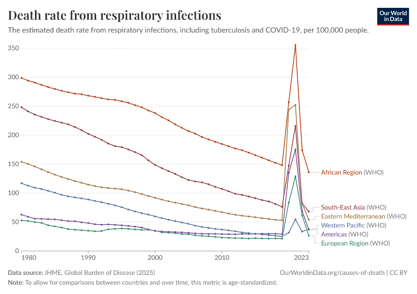 IHME, Global Burden of Disease (2025) – with major processing by Our World in Data. “Death rate from respiratory infections” [dataset]. IHME, Global Burden of Disease, “Global Burden of Disease - Deaths” [original data]. Retrieved March 2, 2026 from https://data-wdi-depsupdate.owid.pages.dev:8789/20260211-174736/grapher/death-rate-from-respiratory-infections.html (archived on February 11, 2026).