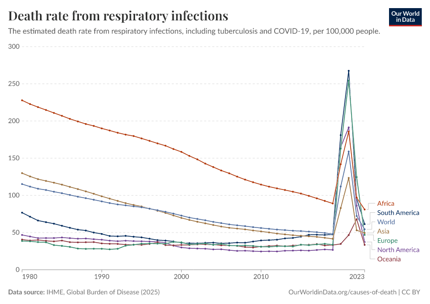 IHME, Global Burden of Disease (2025) – with major processing by Our World in Data. “Death rate from respiratory infections” [dataset]. IHME, Global Burden of Disease, “Global Burden of Disease - Deaths” [original data]. Retrieved March 2, 2026 from https://data-wdi-depsupdate.owid.pages.dev:8789/20260211-174736/grapher/death-rate-from-respiratory-infections-gbd.html (archived on February 11, 2026).