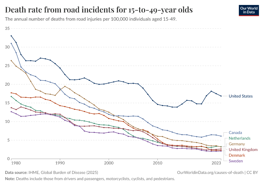 IHME, Global Burden of Disease (2025) – with major processing by Our World in Data. “Death rate from road incidents for 15-to-49-year olds” [dataset]. IHME, Global Burden of Disease, “Global Burden of Disease - Deaths” [original data]. Retrieved March 2, 2026 from https://data-wdi-depsupdate.owid.pages.dev:8789/20260211-174736/grapher/death-rate-from-road-accidents-for-15--to-49-year-olds.html (archived on February 11, 2026).