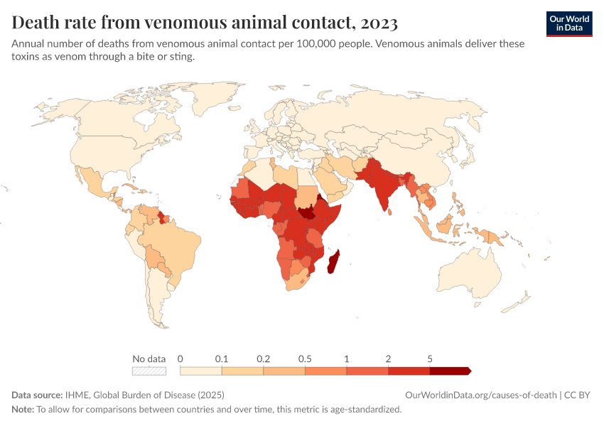 IHME, Global Burden of Disease (2025) – with major processing by Our World in Data. “Death rate from venomous animal contact” [dataset]. IHME, Global Burden of Disease, “Global Burden of Disease - Deaths” [original data]. Retrieved March 2, 2026 from https://data-wdi-depsupdate.owid.pages.dev:8789/20260211-174736/grapher/death-rate-from-venomous-animal.html (archived on February 11, 2026).