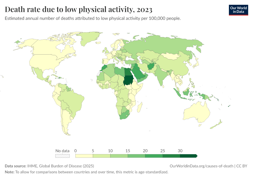“Data Page: Death rate due to low physical activity”, part of the following publication: Esteban Ortiz-Ospina and Max Roser (2016) - “Global Health”. Data adapted from IHME, Global Burden of Disease. Retrieved from https://data-wdi-depsupdate.owid.pages.dev:8789/20260213-112438/grapher/death-rates-due-to-low-physical-activity.html [online resource] (archived on February 13, 2026).How to cite this data