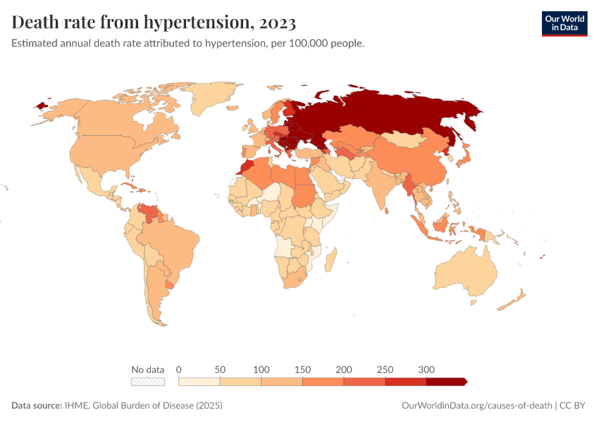 IHME, Global Burden of Disease (2025) – with major processing by Our World in Data. “Death rate from hypertension” [dataset]. IHME, Global Burden of Disease, “Global Burden of Disease - Risk Factors - Deaths” [original data]. Retrieved March 2, 2026 from https://data-wdi-depsupdate.owid.pages.dev:8789/20260213-112438/grapher/death-rates-from-high-blood-pressure-gbd.html (archived on February 13, 2026).