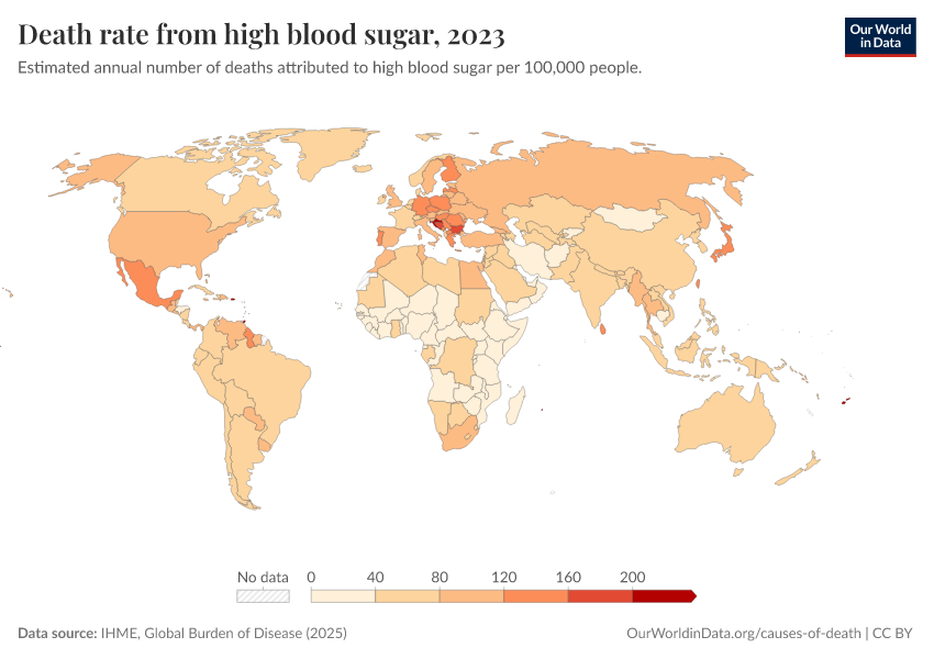 IHME, Global Burden of Disease (2025) – with major processing by Our World in Data. “Death rate from high blood sugar” [dataset]. IHME, Global Burden of Disease, “Global Burden of Disease - Risk Factors - Deaths” [original data]. Retrieved March 2, 2026 from https://data-wdi-depsupdate.owid.pages.dev:8789/20260213-112438/grapher/death-rates-from-high-blood-sugar-gbd.html (archived on February 13, 2026).