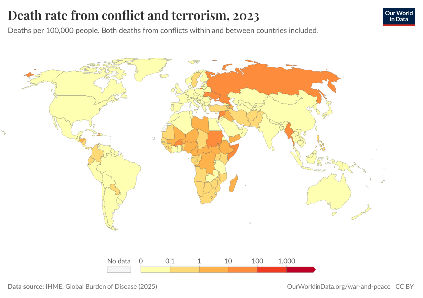“Data Page: Death rate from conflict and terrorism”, part of the following publication: Esteban Ortiz-Ospina and Max Roser (2016) - “Global Health”. Data adapted from IHME, Global Burden of Disease. Retrieved from https://data-wdi-depsupdate.owid.pages.dev:8789/20260211-173942/grapher/deaths-conflict-terrorism-per-100000.html [online resource] (archived on February 11, 2026).How to cite this data