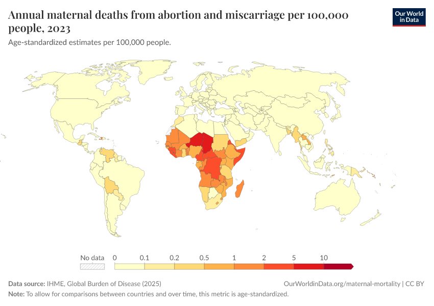IHME, Global Burden of Disease (2025) – with major processing by Our World in Data. “Annual maternal deaths from abortion and miscarriage per 100,000 people” [dataset]. IHME, Global Burden of Disease, “Global Burden of Disease - Deaths” [original data]. Retrieved March 2, 2026 from https://data-wdi-depsupdate.owid.pages.dev:8789/20260211-174736/grapher/deaths-from-abortion-and-miscarriage-per-100000-people.html (archived on February 11, 2026).