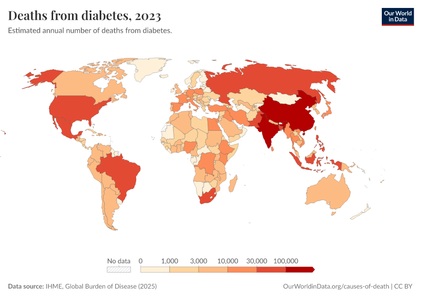 IHME, Global Burden of Disease (2025) – with major processing by Our World in Data. “Deaths from diabetes” [dataset]. IHME, Global Burden of Disease, “Global Burden of Disease - Deaths” [original data]. Retrieved March 2, 2026 from https://data-wdi-depsupdate.owid.pages.dev:8789/20260211-174736/grapher/deaths-from-diabetes.html (archived on February 11, 2026).